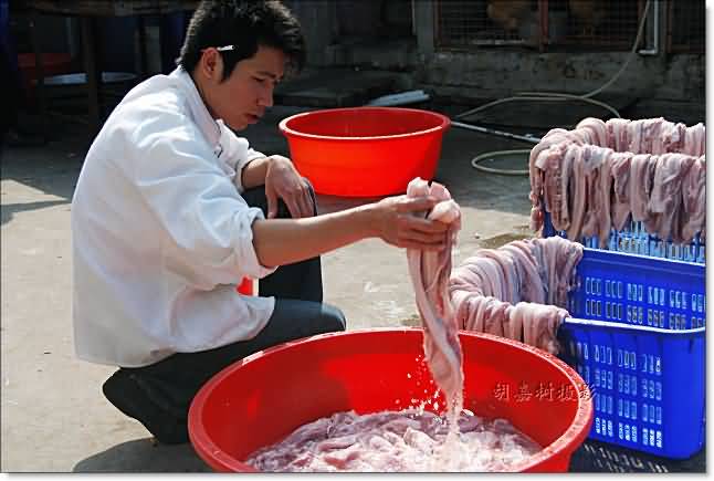 5、腌制好以后趁天气好用淘米水清洗干净.这样经过烘烤后的腊肉干净少黑油腻