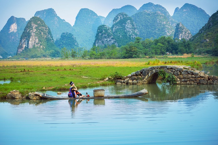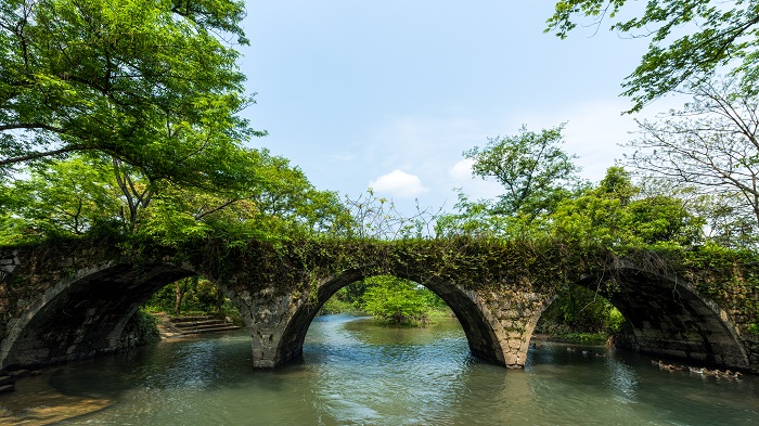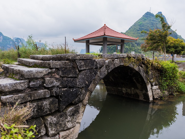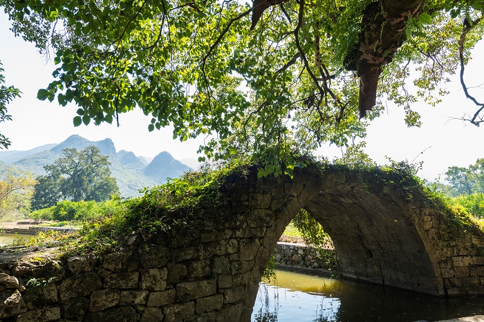 石拱桥横跨在马河之上,这条小河长23千米,密集分布着33座各式各样的古石桥,是桂林附近游览、考察古石桥的绝佳之地。