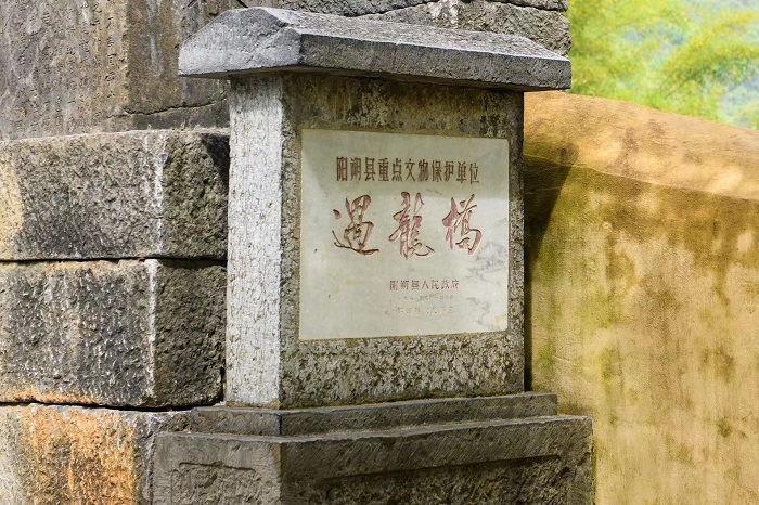陽龍桥用大块青石建造,是桂林仅见的桥亭相接的石拱桥,桥通长10.2米,桥宽4.25米,拱跨7.85米,拱高4.25米。桥头古亭内有数块石碑,由于桥亭遮挡庇护,减少了风雨剥蚀,字迹还比较好辨读。碑刻内容分3类,一是捐赠善款和支出账目的公示;二是叙述古桥来龙去脉的序;三是保护古桥的禁约。桥下河水碧绿宁静,旁边古树枝繁叶茂,古桥、古树、古亭宛如一幅立体的风景画卷。