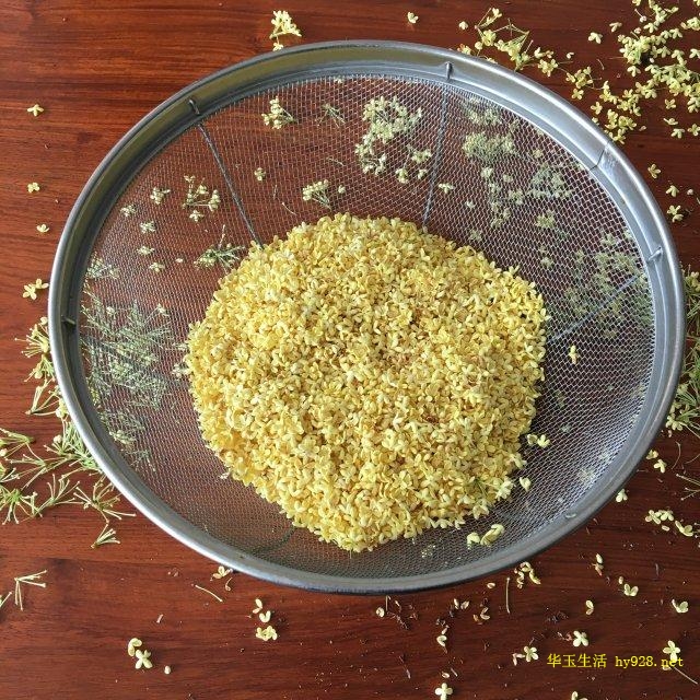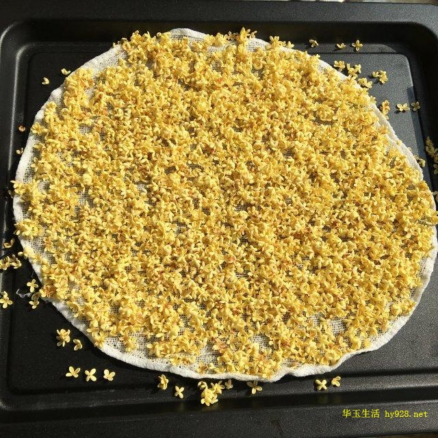 第1步、桂花摘掉花柄(否则有苦味)等杂质,只要花朵即可。