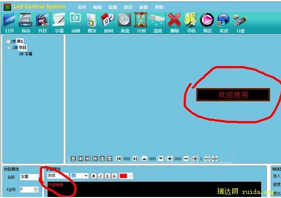 5).当这个黑色的小框在左上角的时候 你的显示屏内容就显示在左上角 黑色的框在哪里你的显示屏内容就显示在哪里 黑色的框显示的多大 你的显示屏就显示多大 如果把黑色框拉到最大 你的显示屏就全屏显示,这里可以分6个黑色的小框可以自由大小 弄两个字幕 一个在左边 一个在右边 显示屏就会左边显示内容 右边也显示内容 中间不显示内容,这就是分区