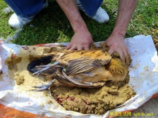 4、黄泥加点水调成粘稠的泥浆,用泥浆把鸡涂满, 一定要渗透到毛根部,表面抹均匀成椭球状;