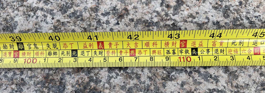 有条件建房的人,无论是大富大贵,还是普通百姓,个个都喜欢讨个好彩头。鲁班尺的刻度有“登科、富贵、迎福、大吉”等字样,在建筑房屋或测量其它阳宅物体时,以红色吉祥的预兆为长度单位,可以大吉大利,反之黑色则凶。结合丁兰尺的尺寸刻度,如下图所示,所有查询尺寸对应的位置,在测量中约定三种结果,分别是“吉”,“凶”和“普通”三种。