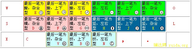 码元当作“末”而有需要识别时,一律用它们向右下角伸得最长最远得笔画“折”来识别。如:仇,WVN;化,WXN。