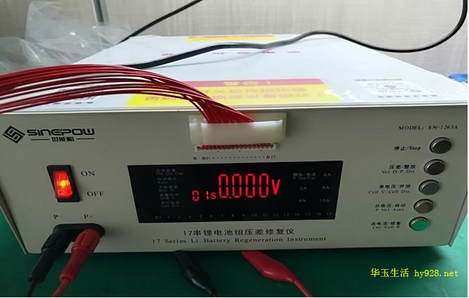 目前专用的修复仪(图6-5)品牌还比较少,其工作原理主要是通过连接电池排线检测每一串的电压,和总电压,可显示压差和检测排线顺序是否正确,通过整组放电至某串电芯达到最低工作电压,再通过每串单独放电致最低工作电压以达到修复压差的目的。修复仪在组装时也可以用作快速检测排线顺序和测量各串压差的工具。