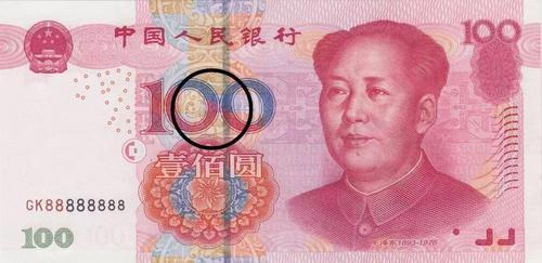 这只凤鸟来源于战国时期的漆器图案,若隐若现地印在钞票正面“100”字样的背景中,大概是这个位置: