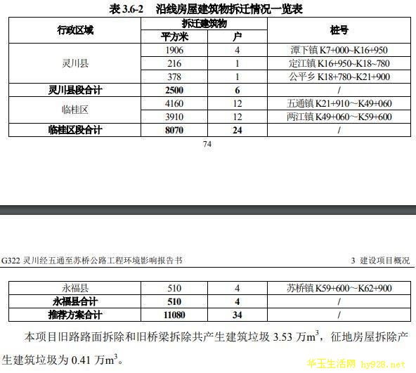 本项目沿线拆迁房屋建筑物共 11080m2行政区域,房屋全部为砖混结构,共涉及 34 户房屋,其中灵川县 6 户,临桂区 24 户,永福县 4 户。另外,拆迁电缆 7.7km,拆迁光缆 20.0km,拆迁低压电力设施 11.5km。