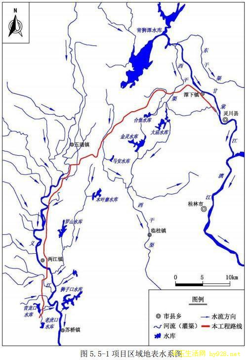 项目起点位于灵川县潭下镇桥头新村附近,接灵川县灵青二级公路上跨桂柳高速跨线桥桥尾,路线向西途经潭下镇,然后路线在砖塘折向南,经定江镇、岩山、五通镇、渡头、两江镇,路线终于永福县苏桥镇,终点交于永福县苏桥镇市政路金桂北路与水荆西路交叉路口,接 G322 线苏桥至永福段(在建)。