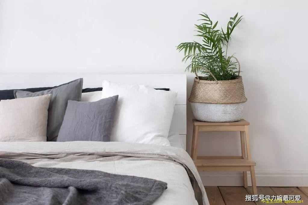 ② 边几:原本是出现在茶几、沙发边的物件,放到床头也很适用。给卧室带来北欧风的同时,可以当小小的工作台,床上办公或者看书、看剧都很方便。