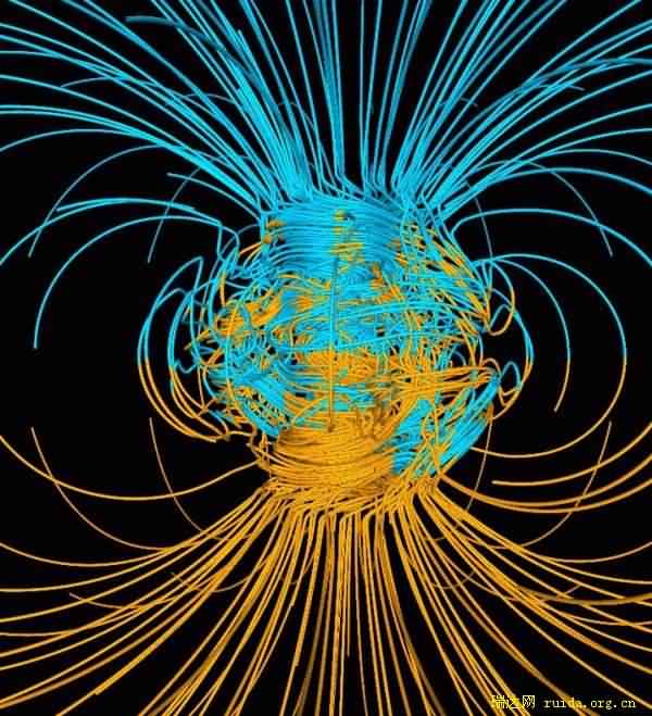 [图片说明]:地球磁场可以被分成两部分,其中最主要的是类似条形磁铁的偶极磁场,另一部分是地壳磁场。图中蓝色和黄色表示的是不同极性的磁力线。