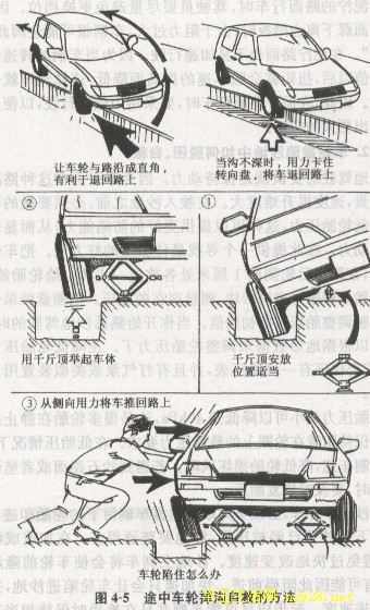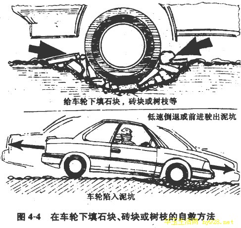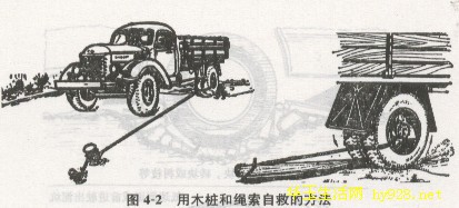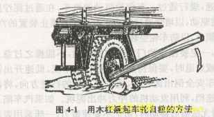 ②挖去泥浆或用木杠撬起车轮,设法在轮胎与泥泞之间填塞石块、木料等硬质物,以增加摩擦力。用木杠撬起车轮自救的方法见图4-1,