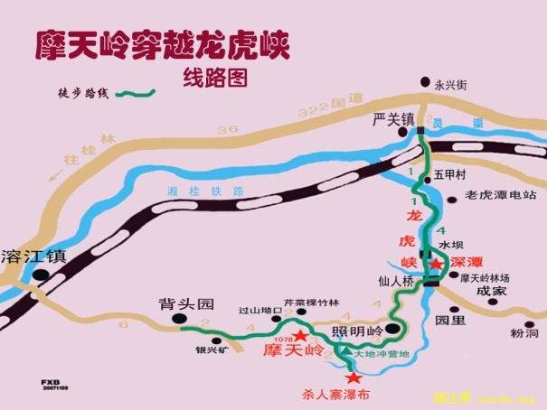 [第1日 桂林乘车经溶江镇至背头园村,徒步至银兴矿部下溪入峡谷上摩天岭坳口后,登顶 13公里] 桂林桂北站(1、18、32、99、100公交车群众路口站下,前行150米)乘兴安班车至溶江路口(36公里 5-7元)——搭乘路边蓬蓬车出322国道经溶江至背头园——沿公路徒步2公里入银兴矿大门到达银兴矿部——屋背下溪,过溪顺路上对面山。山路完全是沿溪而上,越走越难,越行越陡——行40分钟至矿洞,由此再往上的半小时路途是最为陡峭的路段,几乎是直上。攀枝拉藤登攀——上去是坳口。坳口南是丛林,北为草甸。不下草甸,右路登山。方向右手边山包——登上山包,前方望见的便是摩天岭顶。看准方向,朝它走去。顶登成功——大地冲在溶江的这一面,山泉汇流的方向便是,下望可见。下山有路。越往下越明显——过几个小山包后,来到溪口,这里就是大地冲。放下重装,轻装下杀人寨——沿溪谷下。此处溯溪与别处不同的是,落差大,几乎是在攀岩,但不用脱鞋。逢深潭绝壁不能行走时,山路恰好都在溪的右边——40分钟后到达溪流汇合之开阔地带,右上山过潭,下后再行不远是深渊。已来到杀人瀑的瀑顶。右上攀住树木小心行走,这里是此路段最为险要的地方。下到底是瀑布水潭——原路返回大地冲营地,安营扎寨。