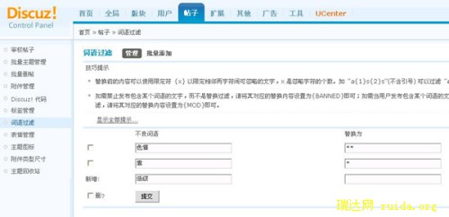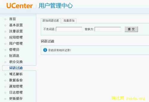 其中,在Discuz!论坛后台设置屏蔽的关键字只能保证帖子内容正当不违规,站长可以在UCenter后台-词语过滤里面进一步设置一些屏蔽的关键字,以保障用户的短消息也能安全。