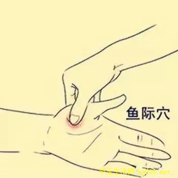 按摩方法:用大拇指按压、揉按鱼际穴,按揉3--5分钟。