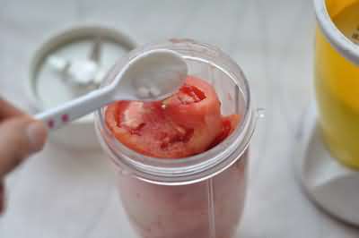 2、生姜切碎片放入料理机杯子,放入西红柿块,一汤匙精盐,开动机器把西红柿,姜片打成泥。