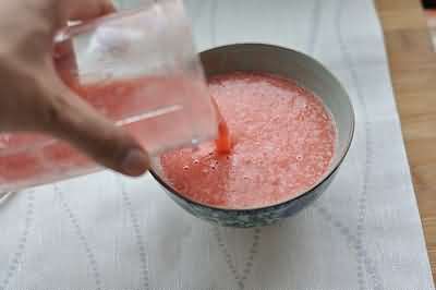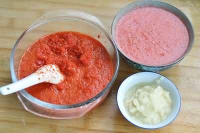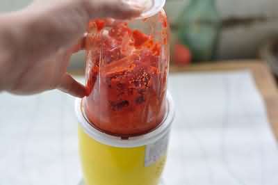 4、红椒切成小段后放入料理机杯子,把红椒打成泥,把红椒泥倒入干净容器,备用。