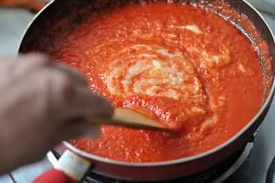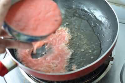 6、锅里倒入植物油,油热后倒入西红柿汁,细火炒制。