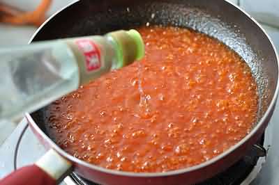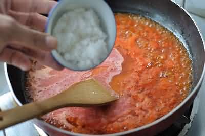 7、等西红柿汁粘稠时倒入白糖,炒成西红柿酱。