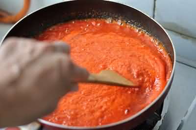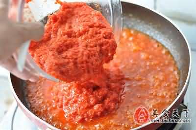 9、炒制西红柿酱粘稠,倒入辣椒泥,小火炒制粘稠。