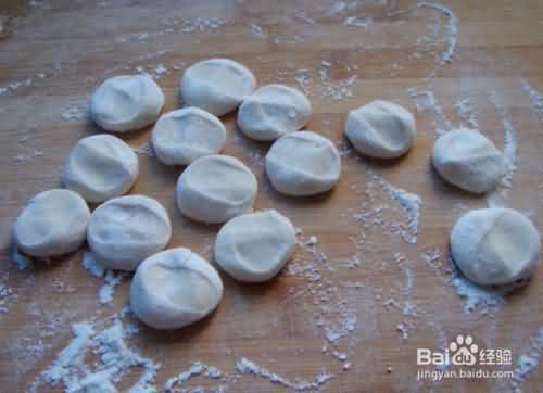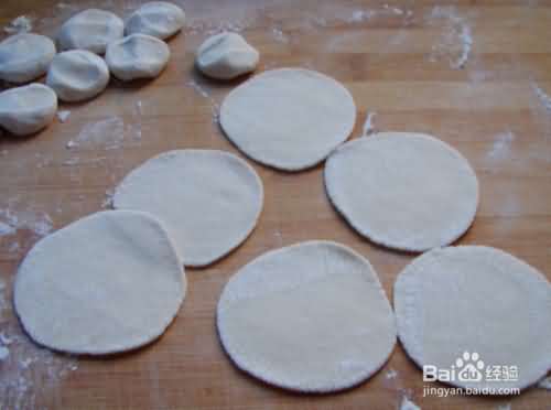 8、用小擀面杖将小面剂檊成圆形,就可以包饺子了。