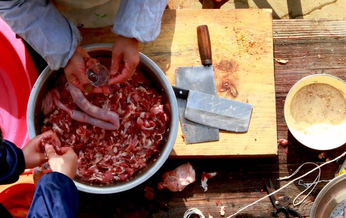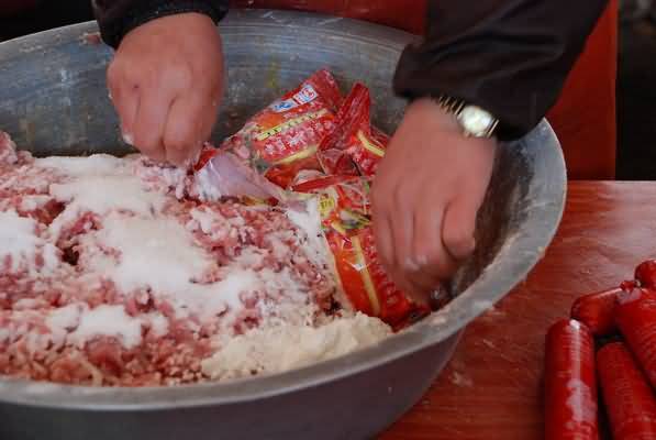 3、用漏斗(或矿泉水瓶裁剪成)把肉装入反过来的小猪肠内