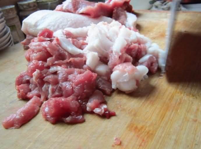 1、把猪肉分切成块条状。按个人喜欢瘦肉肥肉搭配4-6分