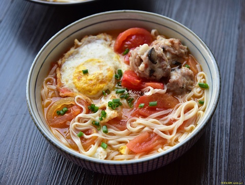 1 这是用来做面条的部分材料,肉丸是我自己做的,用猪上肉剁碎,加入剁碎的鱿鱼和香菇,拌匀,再加入淀粉、盐、料酒等调料,拌匀,挤出一个个肉丸蒸熟,这些肉丸子有香菇和鱿鱼爽口又好吃
