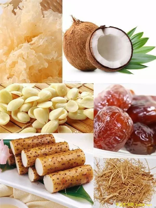 材料:椰肉1个、山药1段,南北杏1两,蜜枣2个、雪耳、参须少许