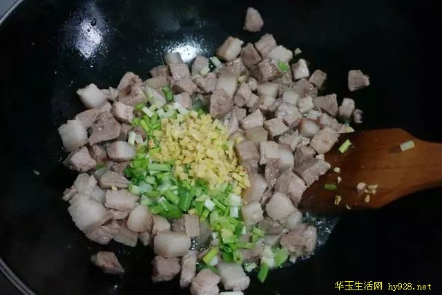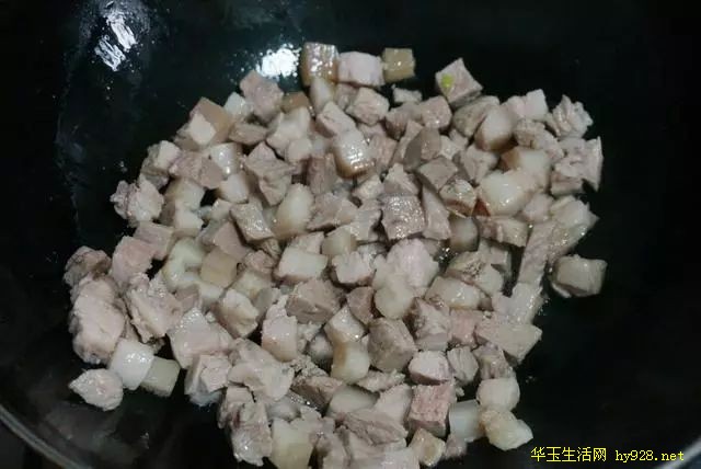 3. 锅中放油,油热后放入肉丁,炒至变色后加1勺料酒翻炒。