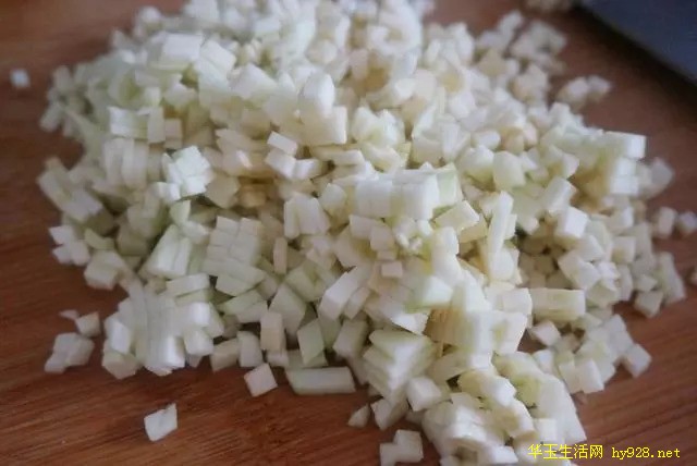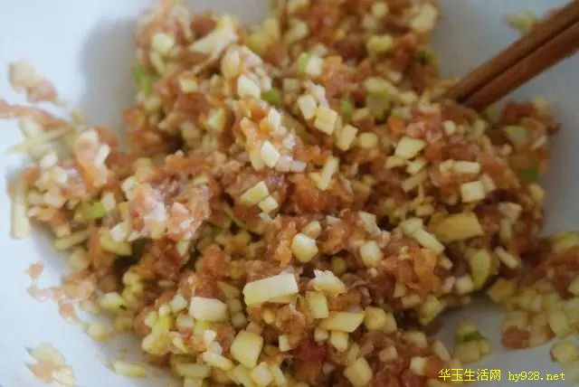 2.肉馅中,加入3克盐,少许白胡椒粉,一勺香油,蛋清1个,葱姜蒜末适量,再加入茄子丁拌匀。