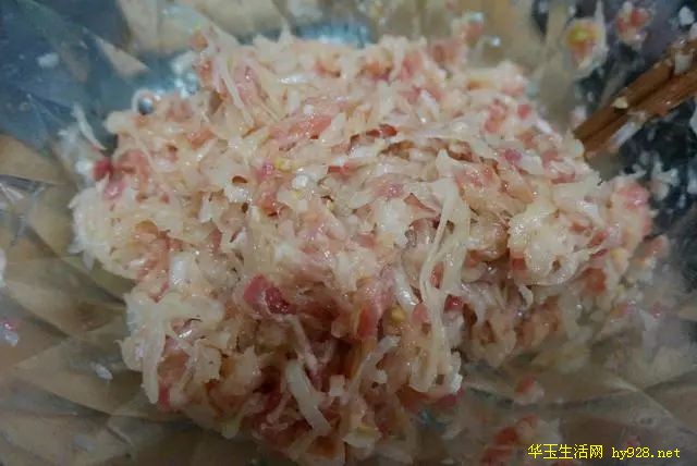 2.肉馅中,加入3克盐,少许白胡椒粉,一勺香油,少许姜末,攥好的萝卜丝拌匀。