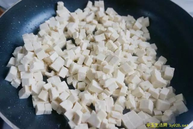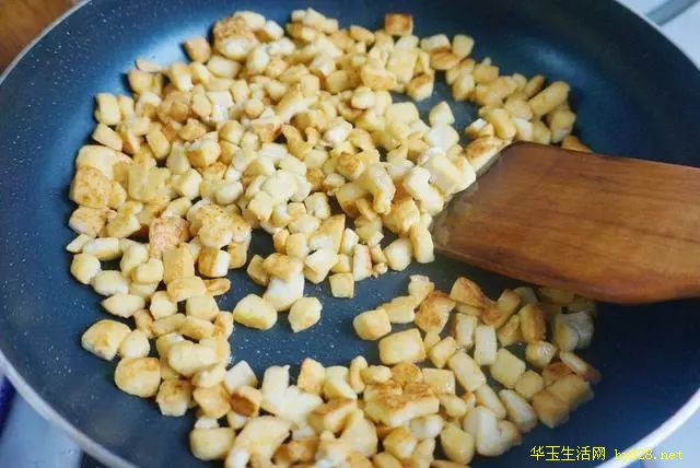 3.中小火将豆腐煎至表皮变硬变金黄。