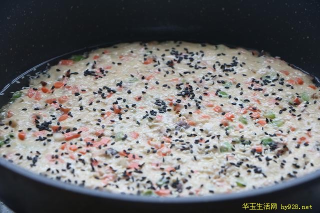 9、平底锅刷一层植物油,把面糊倒进去,摊平整,表明撒适量黑白芝麻,盖上盖子醒发15分钟;