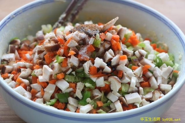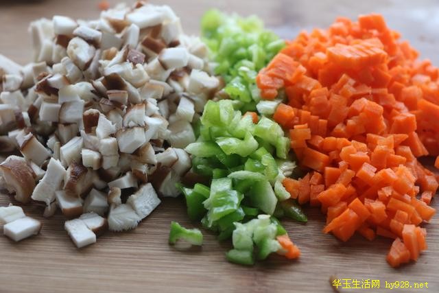 6、香菇、青椒、胡萝卜切成小丁备用;
