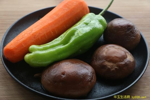 5、准备自己喜欢的配菜,香菇、青椒洗净、胡萝卜去皮、
