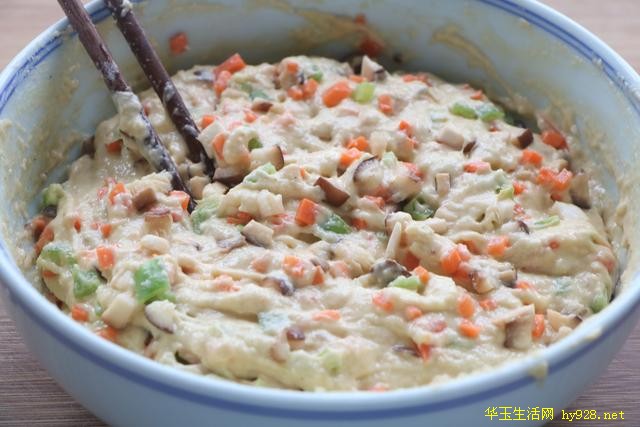 7、然后加在面糊碗中,加入盐、五香粉、蚝油;