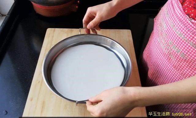 8.将凉皮罗罗放在凉水盆内,轻轻转动,放凉后用铲子将凉皮取下。