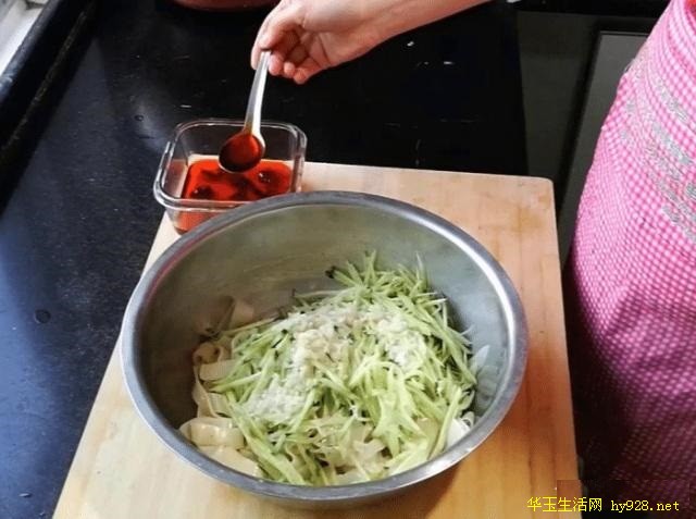 10.将凉皮切成宽条,放入适量的黄瓜丝,蒜水,米醋,辣椒油。