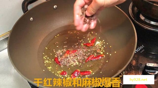 锅内放入干红辣椒,麻椒粒爆出香味