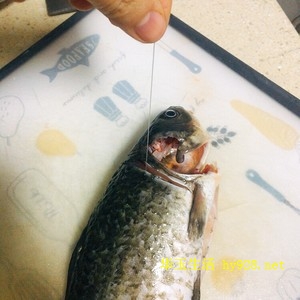 2、鲫鱼背上两边有两条白筋,这个就是“鱼腥线”了。(在离鱼头下一点的地方切一刀,会看到一根白色的很细的线,这就是腥线,再在鱼尾巴的稍微往前一点的地方在切一刀,用刀背轻轻拍打鱼的身体,然后用手或镊子就可以轻松的把它抽出来了。清洗干净用厨房纸擦干水分备用。