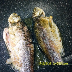 3、热锅放油加少许盐,这样煎鱼鱼皮不容易粘锅皮烂,鲫鱼煎至两面金黄(煎鱼的时候不要急着翻动,轻轻晃动下锅,鱼可以随之滑动就可以翻面了)