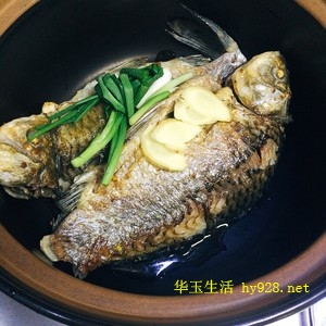 4、放入生姜片、葱结,开大火加入开水末过鱼(重要的事说三遍:开水开水开水,一定要开水)大火煮五分钟后加入适量的盐,再改中小火继续煮十五分钟。